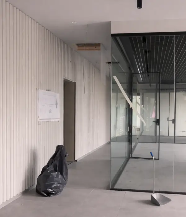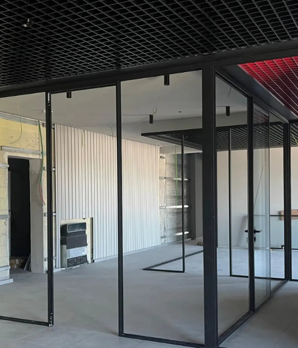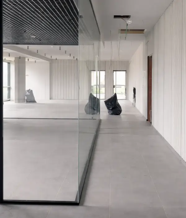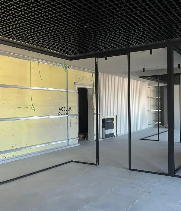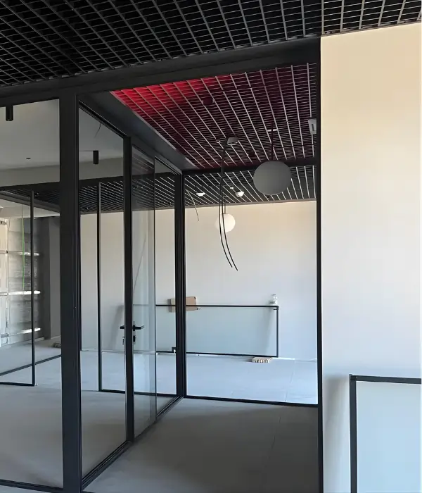 Utilizzo di pareti in vetro di sicurezza con profili minimalisti in alluminio nero. Questa soluzione ha permesso di mantenere una visuale continua, aumentando la percezione di ampiezza degli uffici.